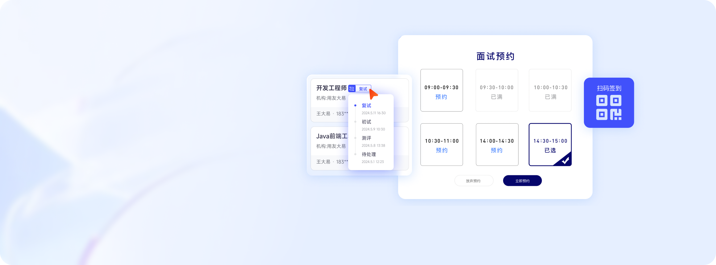 候选人可以像影院选座一样,通过PC或移动端自助预约面试时间,给予候选人充分的尊重和自由