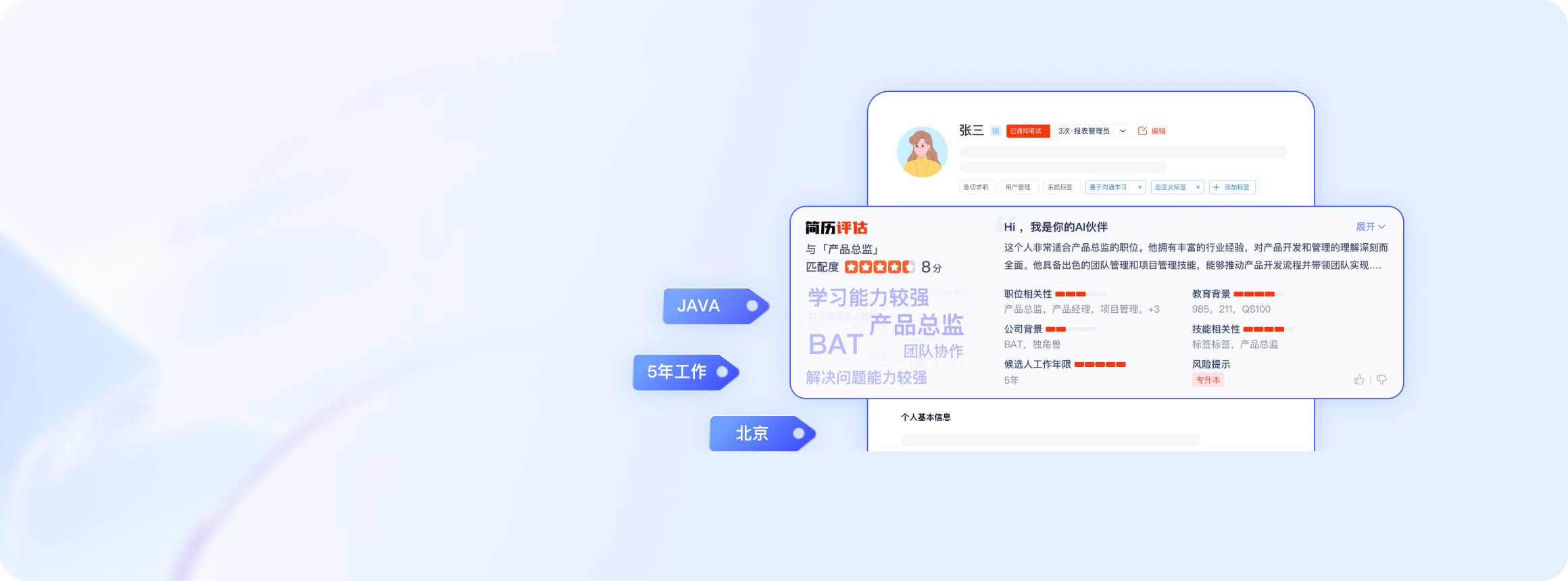智能评估人岗匹配度,词云直观展示人才优劣势,精准甄别优质人才